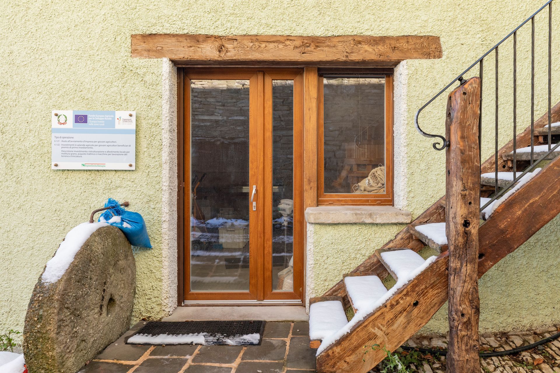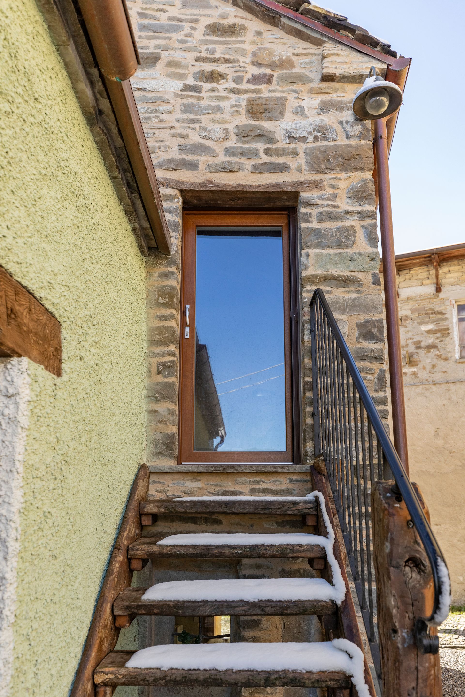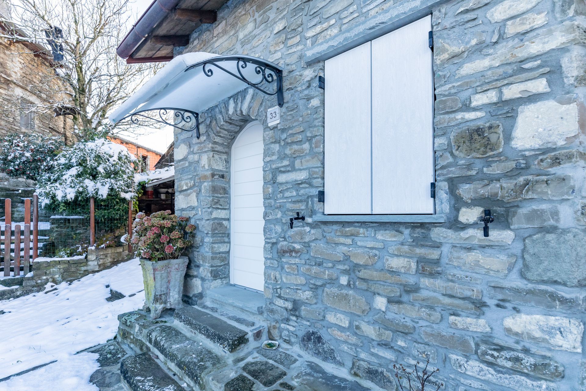 La porta in legno bianco, abbinata agli scuri, è progettata per garantire tranquillità e privacy. L'aspetto semplice e pulito si integra con l'ambiente naturale, offrendo isolamento e sicurezza senza rinunciare all'eleganza del design moderno. L'incontro tra la robustezza della pietra e il calore del legno regala una sensazione piacevole per lo sguardo, che anticipa l'esperienza di calore e protezione all'interno.