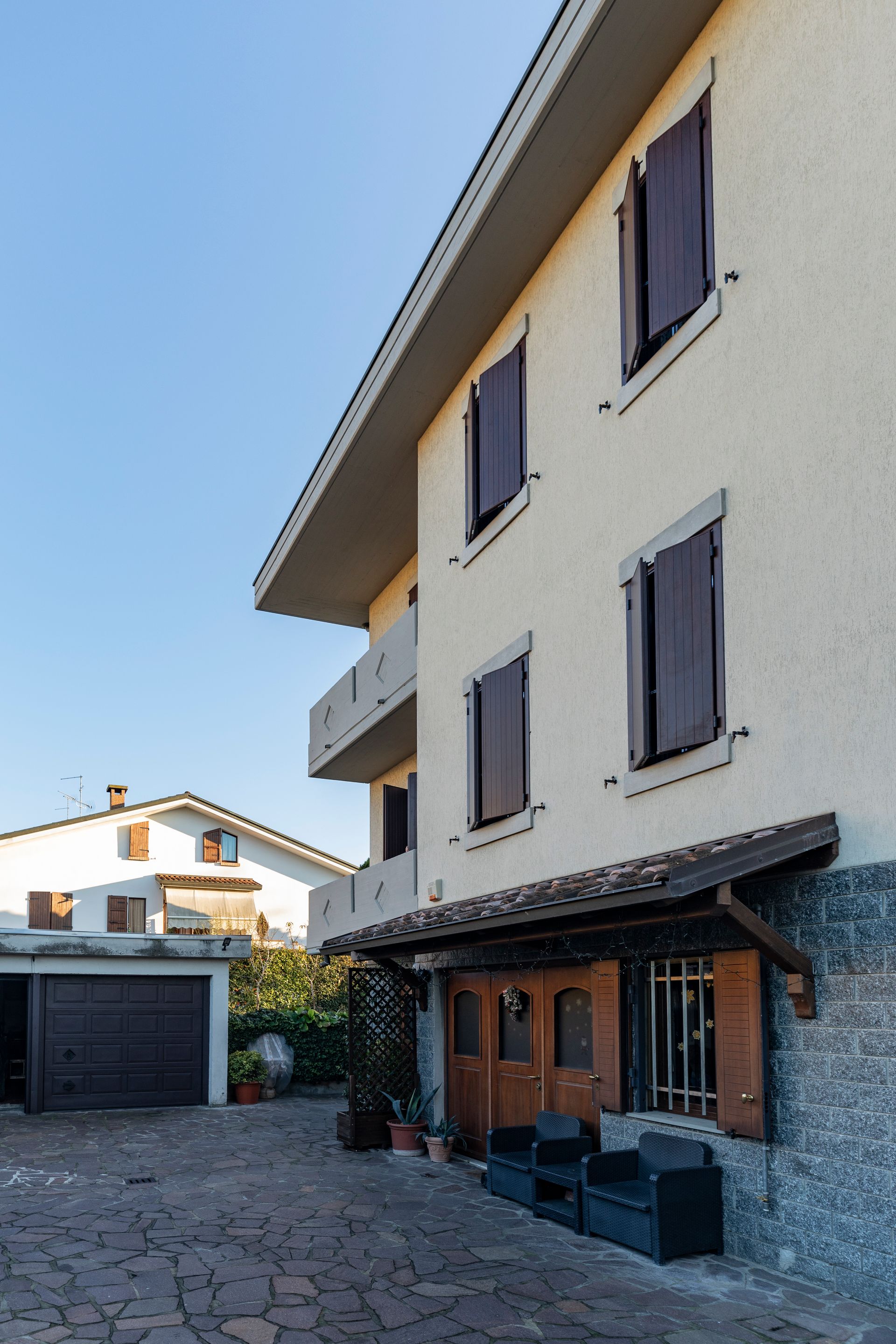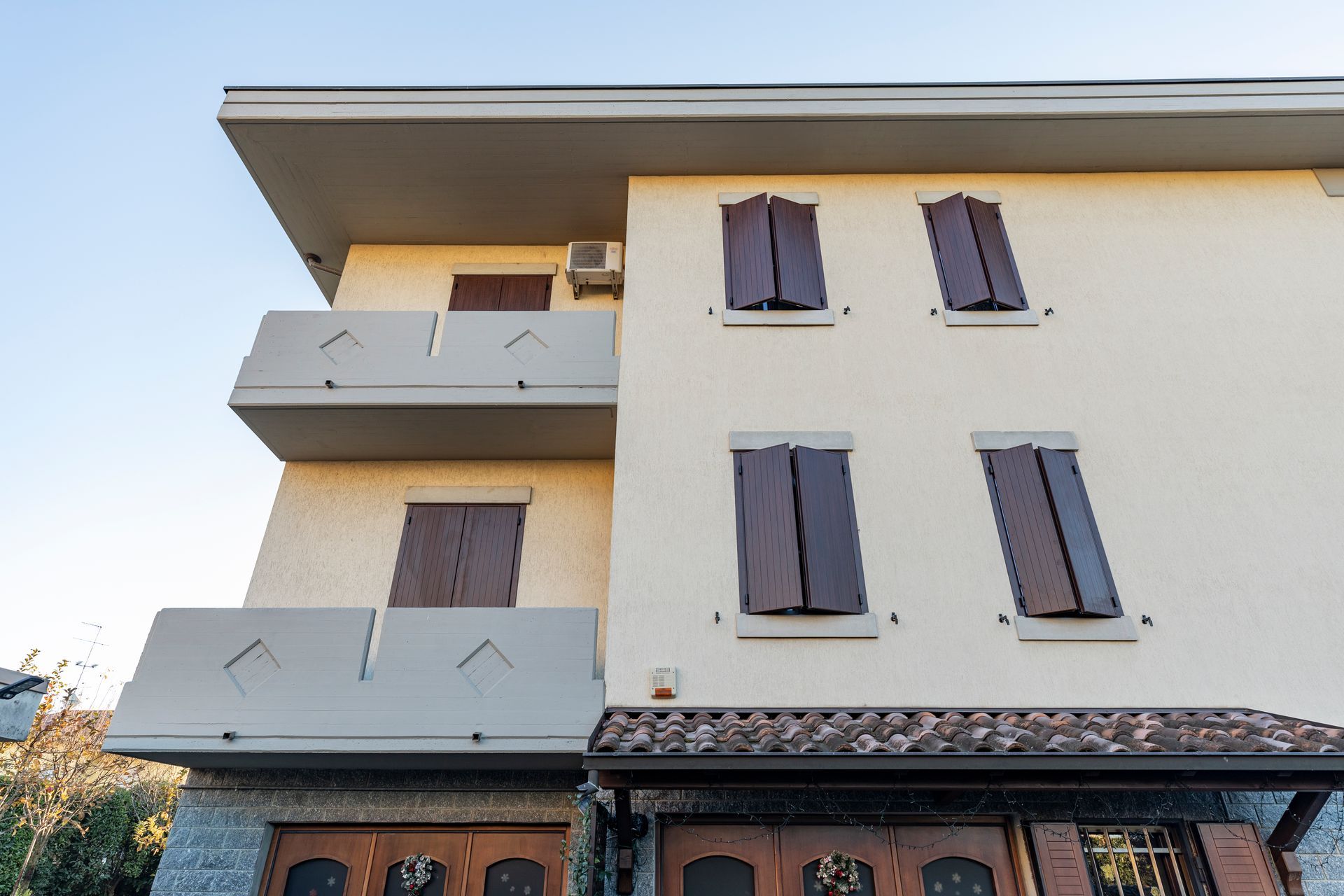 La funzionalità incontra lo stile: gli scuri di questo edificio si distinguono per il loro design essenziale, offrendo una solida barriera contro gli elementi esterni e integrando sicurezza con estetica. La loro finitura in legno aggiunge un tocco naturale e tradizionale all'aspetto della costruzione, mentre la semplicità delle linee conferisce un'impressione di ordine e pulizia all'intero contesto abitativo